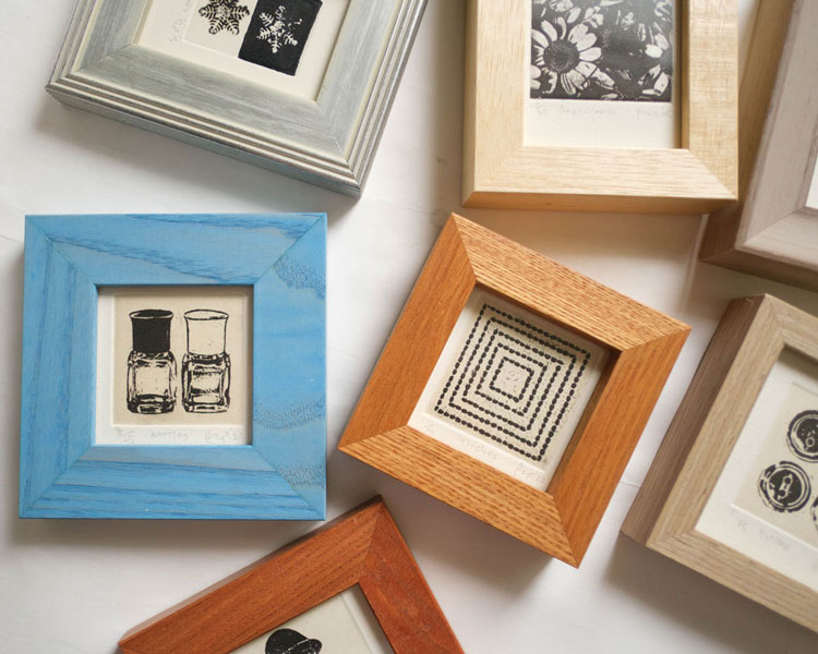 いつ販売されるかまっっったく分からない世界堂と、清澄白河のサトウ画材さんのミニ額。どちらも端材で作られているので、ほとんどが一点物。版画ゆうびんに合いそうなもの、どんな作品にも使えそうなものを見つけ次第買っておくというやり方なので、派手目な色は普段はどんなに可愛くて欲しくても購入しません。