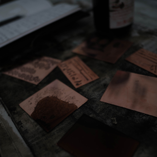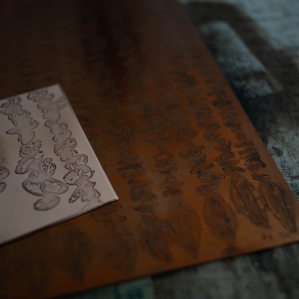 4月の下旬から始まった展示準備と搬入出と出荷の渦の中、その合間合間、銅の板にへばり付き作っていました。展示期間中は自分の作品について色々と考えます。更に今回は、展示を通してたくさんの方との新しい出会いがあり、素晴らしい時間を過ごしました。そのような日々の中で、最初あったイメージはどんどんと変化し、完成かと思うと、いやもっとこうしたい...と作り直すこと3回。大切な一枚となりました。
